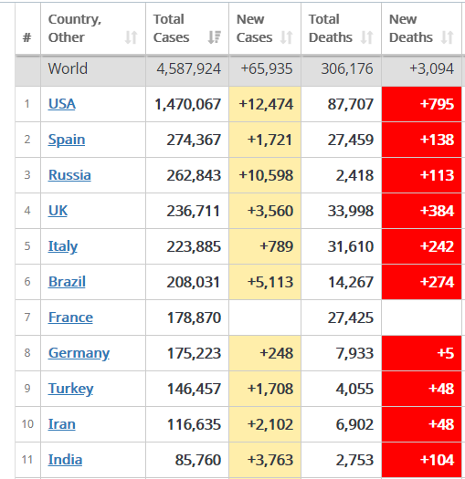 कोरोना संक्रमण विश्व तालिका: चीन को पीछे छोड़ नंबर 11 पर पहुंचा भारत